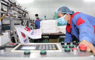 在海南金鹿工业园的一家全生物降解塑料制品生产企业,工作人员在操作制袋机。