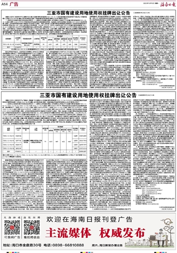 二、竞买事项:(一)竞买人资格范围:凡在中华人民共和国境内外的法人、自然人和其他组织(法律另有规定的除外)均可申请参加竞买,申请人单独申请,不接受联合申请。失信被执行人不得参加本次竞买。根据片区产业规划发展的要求,该宗地拟用于建设人工智能双创中心项目,竞买人或其关联企业须从事人工智能产业,并具备国家级高新技术企业相关资质。该宗地竞买人资质由三亚崖州湾科技城管理局初审。具有下列行为的法人、自然人和其他组织不得参加本次土地出让挂牌:1.在三亚市范围有拖欠土地出让金行为,并未及时改正的。2.在三亚市有闲置土地、违法利用农村集体土地建设商品住房、擅自改变土地用途等违法行为,并未及时纠正的。(二)保证金及付款方式:根据2021年2月17日三亚市人民政府对《三亚市自然资源和规划局关于调整我市国有建设用地使用权出让竞买保证金缴交比例、土地出让金缴纳额度及缴款时间等有关问题的请示》的批示精神,该宗地竞买保证金为人民币1643万元整(即挂牌出让起始价的60%),竞买人交保证金之前必须先通过挂牌出让竞买人资质的审查。三亚崖州湾科技城管理局出具初审文件的截止时间为2022年11月2 日。若5年租赁期价款低于竞买保证金时,则竞得人已缴纳的竞买保证金在扣除租赁期价款后,剩余部分予以退还。同时,竞得人应自《国有建设用地使用权先租后让合同》签订之日起60日内一次性缴纳完全部租赁期价款(年租金按土地总价款的5%确定,租赁年限为5年)。逾期未付清全部租赁期价款的,土地行政主管部门有权依法解除合同,并由竞得人承担相应的违约责任。根据2022年9月29日海南省自然资源和规划厅印发的《关于海南省土地交易市场竞买保证金可使用银行保函的通知》(琼自然资函〔2022〕1834号),该宗地可采用银行保函方式缴纳土地竞买保证金。(三)竞买申请人可于2022年10月10日至2022年11月8日到三亚市房产信息中心(海南南部拍卖市场有限公司)或海南省公共资源交易服务中心一楼受理大厅3号窗口(土地矿业权交易)咨询和领取《挂牌出让文件》(《挂牌文件》为本公告组成部分),有意参加竞买的,应提交书面申请并按《挂牌文件》规定办理相关手续。交纳竞买保证金的截止时间为2022年11月8日16时30分。经审核,申请人具备申请条件并按规定交纳竞买保证金后,三亚市自然资源和规划局将在2022年11月8日17时30分前确认其参加竞买资格。(四)本次国有建设用地使用权挂牌活动在海南省政府会展楼二楼省公共资源交易服务中心土地交易厅进行。该宗地挂牌时间为:2022年 10月31日09时00分至2022年11月10日09时00分。(五)确定竞得人原则:1.在挂牌期限内只有一个竞买人报价,且报价不低于底价并符合竞买条件,确定该竞买人为竞得人。2.在挂牌期限内有两个或者两个以上竞买人报价的,确定出价最高且不低于底价者为竞得人,报价相同的,确定先提交报价单者为竞得人。3.在挂牌期限内无人应价或者竞买人报价均低于底价或不符合其他条件的,不确定竞得人。4.在挂牌期限截止前仍有两个或者两个以上的竞买人要求报价的,则对挂牌宗地进行现场竞价,出价最高且不低于底价者为竞得人。(六)本次竞买活动进行现场书面报价,不接受电话、邮寄、电子、口头报价。(七)成交价款含耕地占用税,其他相关税费由竞得人按规定缴纳。(八)其它事项:该宗地以现状土地条件挂牌出让。本次挂牌出让事项如有变更,以届时变更公告为准。