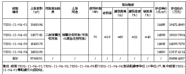 一、挂牌出让宗地基本情况和规划指标等要求:(一)挂牌出让宗地基本情况:本次挂牌出让宗地位于三亚崖州湾科技城控规YK02-11-04-01、YK02-11-04-02、YK02-11-04-03和YK02-11-04-04地块,面积57368.51平方米,用地四至及界址坐标详见地块勘测定界图。具体情况如下:1.控规YK02-11-04-01地块,面积13433.94平方米。2.控规YK02-11-04-02地块,面积12577.82平方米。3.控规YK02-11-04-03地块,面积16433.76平方米。4.控规YK02-11-04-04地块,面积14922.99平方米。经核查《三亚市总体规划(空间类2015—2030)》(省政府同意入库版),该宗地用地规划性质均为高新技术及信息产业园区。同时,经核查《三亚崖州湾科技城控制性详细规划》,该宗地用地规划性质均为二类居住用地(用地代码:R2),对应土地用途均为城镇住宅用地(市场化商品住房用地)。2022年9月22日,三亚市人民政府出具了《关于三亚崖州湾科技城控规YK02-11-04-01/02/03/04地块用地具备净地出让条件的证明》,证明控规YK02-11-04-01/02/03/04地块内约86.70亩用地土地征收及“两公告一登记”工作已完成。我市崖州区人民政府已与被征地单位签订了《征收土地补偿协议书》,土地补偿款、安置补助费、青苗和地上附着物补偿费用等款项已支付到位,相关征地材料现存于崖州区人民政府。目前地块上的附着物已清表,无法律经济纠纷,土地开发利用规划条件明确,符合土壤环境质量要求。地块周边可以满足施工建设所需的水、电供应,相关设备、机械可以进场施工作业。该宗地具备净地出让的条件。经我局核查,该宗地不属于非法占地、违法建设行为已经处置到位并组织供应的土地。该宗地概况及规划指标等情况详见下表: