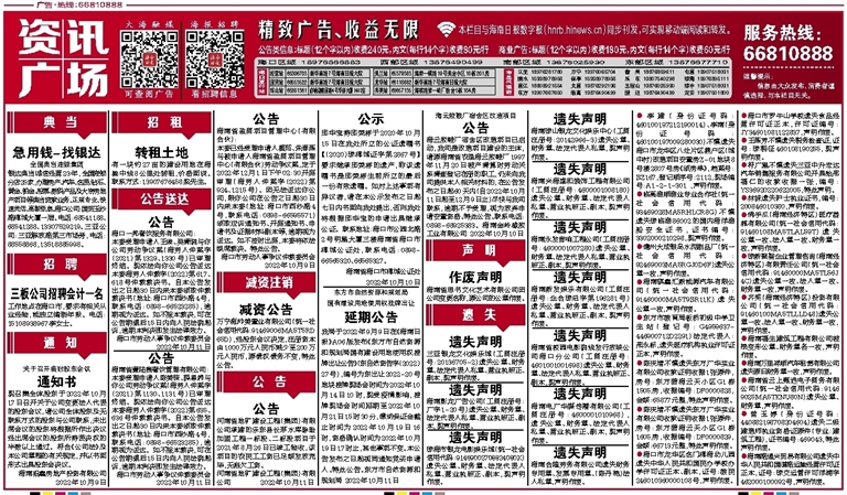 海南影龙广告公司(工商注册号: 广字1-20号)遗失公章、财务章、法定代表人私章、营业执照正、副本,现声明作废。