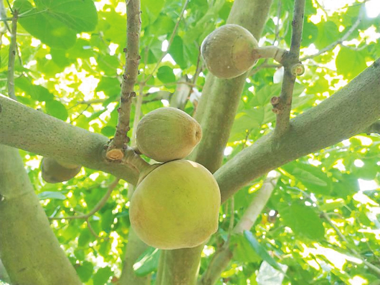 椰蜜果簇生在树干上,果实外形酷似椰子,外皮棕色厚实,果实通常能长到1斤以上。该果成熟后,果蒂周围呈现一圈淡黄色。果实通常有五瓣,果肉橙红,香甜多汁,有着类似甜瓜、哈密瓜的甜美味道。