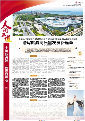 砥砺奋进,勇毅前行。过去十年来,三亚高度重视旅游业发展,把旅游产业作为重要支柱产业来培育,不断完善旅游产品和服务供给体系,提升旅游项目和配套设施建设水平,产业规模持续扩大,新业态不断涌现,旅游业对经济平稳健康发展的综合带动作用更加凸显。