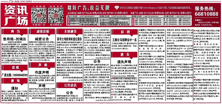●海南城市假日连锁酒店有限公司中山南路店不慎遗失特种行业许可证副本,证号:海公特旅字第0099号,声明作废。