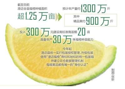 经过14年的打造,“澄迈福橙”已成为澄迈县一大特色农产品品牌。福橙品质优良,富硒低酸,备受生产者和广大消费者欢迎。今年,澄迈县瞄准农产品全流程标准化的发展目标,推动福橙产业全链条、全方位更新升级,首创“钻石果”“黄金果”“电商果”的分级交易模式,不仅按照统一育苗标准和种植手段进行前端种植,更要让上市的每一箱福橙都品质统一,有源可溯。未来“澄迈福橙”产业将走精品水果之路,以高品质取胜,提高农业产业效益。