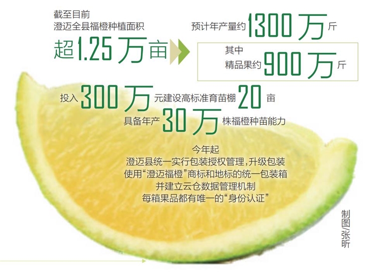 截至目前,澄迈全县福橙种植面积超1.25万亩,预计年产量约1300万斤,其中精品果约900万斤。