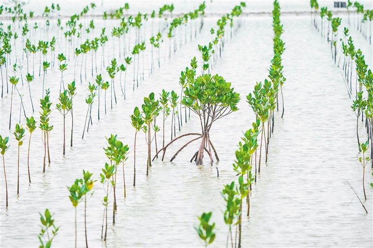 儋州新英盐场红树林恢复造林工程自2020年启动后,大片滩涂重新披上绿洲。近年来,海南加大对红树林等湿地生态系统的保护力度,全省红树林面积逐年增加。