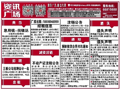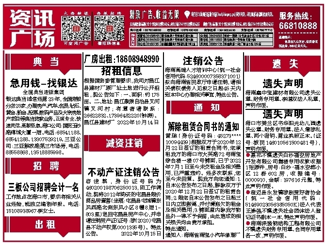 容佳琪,身份证号码为460200198706250013,因工作调动,现将2012年购买的屯昌县限价商品房壹套(坐落:屯昌县屯城镇东风西路北侧东风小区8幢8层1-803室)退回屯昌县房产中心,并申请注销房产证(证号:琼(2020)屯昌县不动产权第0001335号)。特此公告。 2022年10月15日