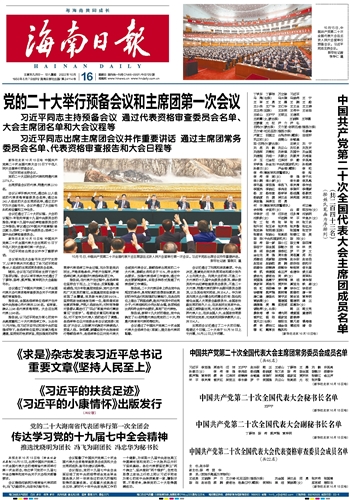 | 海南日报 头版 001 2022-10-161 2022年10月16日 星期日 |