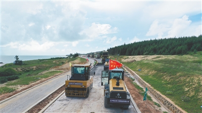 10月16日上午,海南环岛旅游公路项目施工现场,摊铺机等机器设备在作业。