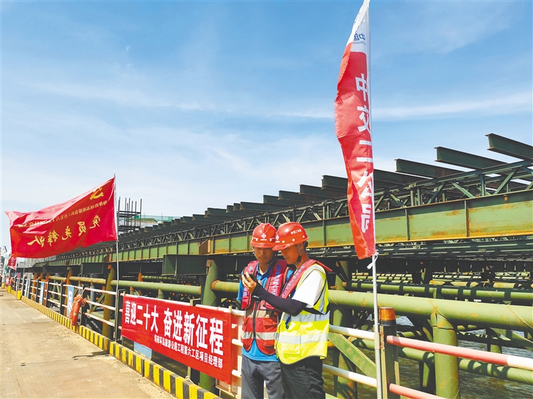10月16日上午,海南环岛旅游公路项目施工现场,两名工人在用手机收看党的二十大开幕会。
