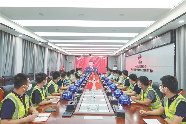 和平时不太一样的是,项目部大门口插上了国旗,工地上“喜迎党的二十大”等红色条幅随处可见。“今天党的二十大在北京人民大会堂开幕,我们这装扮得格外喜庆。”邓小强笑着说。上午9时许,党员干部们陆续走进会议室,准备集中收看电视直播,第一时间聆听二十大报告。