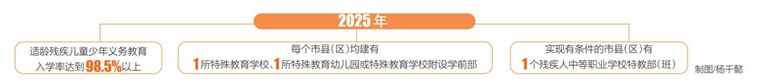 同时,我省加快推进特殊教育体系向学前和高中阶段、高等教育阶段两端延伸。到2023年底前,海口、三亚和儋州分别建成1所至2所专门招收残疾儿童的特殊幼儿园,鼓励其他有条件的市县(区)建设特殊教育幼儿园,到2025年每个市县(区)均建有特殊教育幼儿园或附设幼儿园(学前部);推动特殊教育学校增设职教部(班),鼓励普通中等职业学校增设特教部(班),支持有条件的市县(区)举办残疾人中等职业学校,到2025年实现有条件的市县(区)有1个残疾人中等职业学校特教部(班);鼓励省内高校增设适合残疾学生就读的相关专业,完善残疾学生就读普通高校措施,探索省内有关高校面向全省残疾学生单独招生。支持普通高校、开放大学等面向残疾人开展继续教育。
