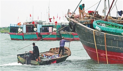 10月18日,在儋州市白马井中心渔港,渔民在做防风工作。