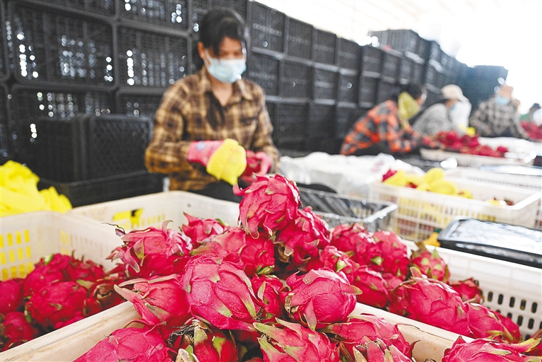 近日,东方市进入火龙果采收期,工人在一处种植基地包装火龙果。