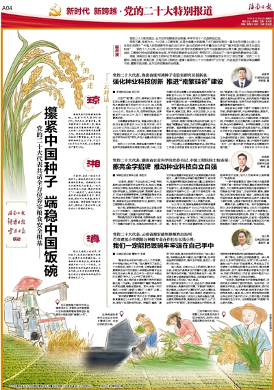 海南、湖南和云南3省在水稻种业发展创新上各具优势与特点,为保障粮食安全作出了突出贡献。党的二十大期间,海南日报、湖南日报、云南日报3报联动,邀请3省党的二十大代表展开“云对话”,共话坚定不移推动落实藏粮于地、藏粮于技战略,全方位夯实粮食安全根基。