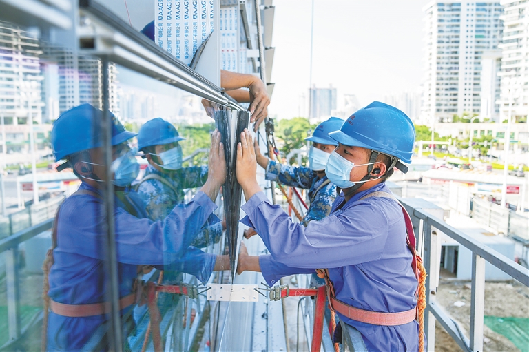 近日,在三亚中央商务区五矿国际广场项目工地,工人正在进行玻璃幕墙施工。