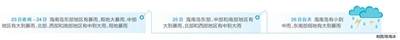 受其影响,我省将有一次较强风雨天气过程。23日夜间~24日,海南岛东部地区有暴雨、局地大暴雨,中部地区有大到暴雨,北部、西部和南部地区有中到大雨、局地暴雨。25日,海南岛东部、中部和南部地区有大到暴雨,北部和西部地区有中到大雨。26日白天,海南岛有小到中雨,东南部局地有大到暴雨。