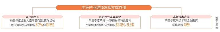 ——主导产业继续发挥支撑作用。现代服务业逆势增长,前三季度全省大宗商品交易、远洋运输增加值同比分别增长8.7%和10.8%。热带特色高效农业增势较好,前三季度茶叶、中草药材等特色品种产量和播种面积分别增长63.8%、21.3%。高新技术产业平稳发展,前三季度高技术制造业投资同比增长48%,占全省投资的比重同比提高0.5个百分点。产业投资(不含房地产开发)保持增长,前三季度同比增长1.5%,占投资比重提升至30.4%。