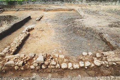 经过半个多月的持续发掘,考古队发现有年代感的多处房屋遗迹,主要为墙基5条,均由杂乱不一的石块垒砌,石块间有残留白色石膏泥,墙基均不同程度遭破坏,其中一条南北向墙基中间有明显的排水槽。建筑构件有条石、柱础和大量残破的陶质砖、瓦、滴水等。