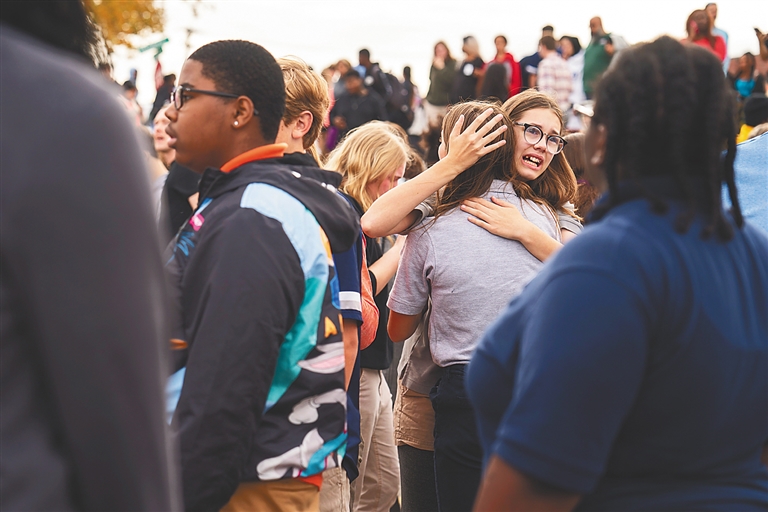 10月24日,在美国密苏里州圣路易斯,人们聚集在发生枪击事件的高中外。
