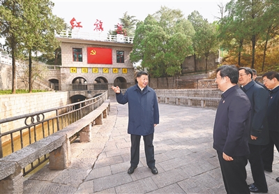 28日上午,习近平来到河南安阳林州市红旗渠纪念馆。上世纪60年代,当地人民为解决靠天等雨的恶劣生存环境,在党和政府支持下,在太行山腰修建了引漳入林水利工程,被称为“人工天河”。习近平走进展馆,依次参观了“千年旱魔,世代抗争”、“红旗引领,创造奇迹”、“英雄人民,太行丰碑”、“山河巨变,实现梦想”、“继往开来,精神永恒”等展览内容。习近平指出,红旗渠就是纪念碑,记载了林县人不认命、不服输、敢于战天斗地的英雄气概。要用红旗渠精神教育人民特别是广大青少年,社会主义是拼出来、干出来、拿命换来的,不仅过去如此,新时代也是如此。没有老一辈人拼命地干,没有他们付出的鲜血乃至生命,就没有今天的幸福生活,我们要永远铭记他们。今天,物质生活大为改善,但愚公移山、艰苦奋斗的精神不能变。红旗渠很有教育意义,大家都应该来看看。随后,习近平实地察看红旗渠分水闸运行情况,详细了解分水闸在调水、灌溉、改善生态环境等方面的重要作用。