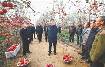 在村苹果洗选车间,习近平听取当地苹果产业发展情况,并察看分拣装箱生产线。现场摆放了当地种植的各种苹果和深加工产品,习近平饶有兴趣地一一端详,仔细听取介绍,对当地发展现代农业和乡村旅游、培育壮大集体经济、带动老乡们增收致富的做法表示肯定。