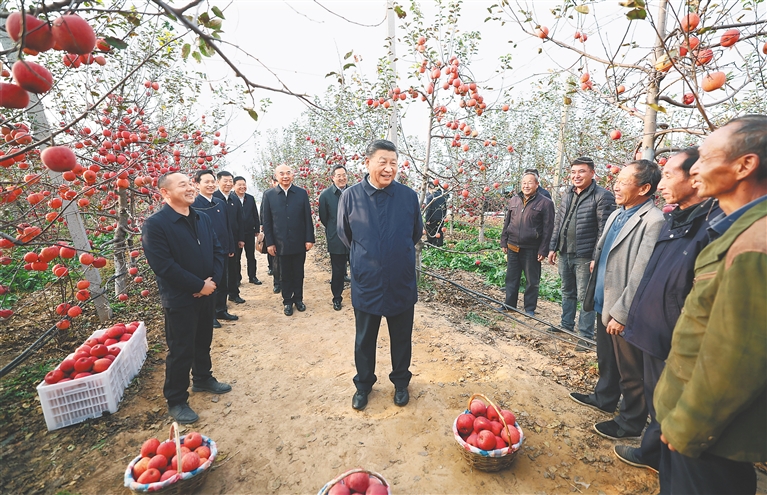 习近平对老乡们说,我在陕北生活了7年,当年看到老乡们生活很艰苦,心里就想着怎么样让大家生活好起来。这次来延安,看到一派硕果累累的丰收景象,交通条件大为改善,发生了翻天覆地的变化。过去陕北老乡们修梯田、种庄稼,面朝黄土背朝天,抡起老锄头干活,广种薄收,十分辛苦,如今山坡上退耕还林种上了苹果,老乡们有工作、有稳定收入,孩子有好的教育,老人都有医保,生活越来越好。从陕北的变化就可以看到中国的变化。习近平指出,现在,“两个一百年”奋斗目标的第一个百年目标已经实现,绝对贫困问题解决了,老乡们过上了好日子,但还要继续努力往前走,让生活越来越美好。陕北的气候、光照、纬度、海拔等非常适宜发展苹果种植,加上滴灌技术、矮化种植技术、选果生产线等不断发展,就地卖出,销路不愁,大力发展苹果种植业可谓天时地利人和,这是最好的、最合适的产业,大有前途。习近平强调,中国共产党是人民的党,是为人民服务的党,共产党当家就是要为老百姓办事,把老百姓的事情办好。空谈误国,实干兴邦。要认真学习贯彻党的二十大精神,全面推进乡村振兴,把富民政策一项一项落实好,加快推进农业农村现代化,让老乡们生活越来越红火。老乡们爆发出雷鸣般的掌声。