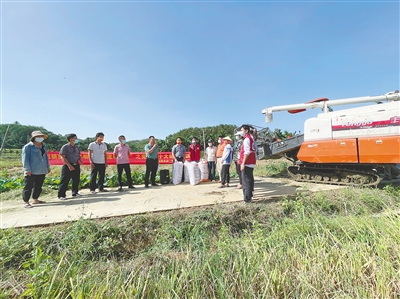 金黄色的稻田里,收割机当背景,生产路充讲台,农户是学习者……10月27日上午9时,五指山市番阳镇孔首村,农歇间隙,十多名村民和干部围站在稻田边,学习党的二十大精神。