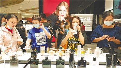 只看氛围,远远不够。再看看明亮橱窗内的各类商品、大幅的时尚海报、扎堆的国际国内知名品牌、挑选商品的人群,感受消费者的“买买买”热情。
