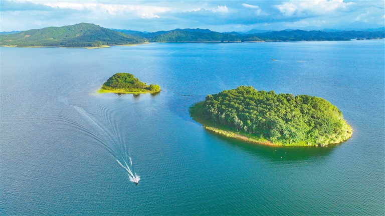 10月26日,在松涛水库南丰库区,水库生态巡查队驾乘生态巡逻快艇在库区水域开展水生态防护巡逻。近年来,松涛库区不断加强对松涛水库的日常管理,水库巡查、水库清洁工作实现常态化,使松涛水库水更清、景更美。图/文 本报记者 陈元才 通讯员 林天