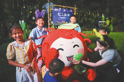 星空为幕,大地为营。10月29日傍晚,在呀诺达雨林文化旅游区的宽阔草坪上,红火露营活动拉开帷幕。现场分为露营区、电影区和天幕区。亲子、情侣、车友结伴出行,许多露营爱好者们共聚于此,共同享受惬意的时光。星空电音派对、星空电影院、自助烧烤、“DIY”红毛丹特饮、“盲盒”礼物交换……当晚的潮玩活动内容丰富多彩,涵盖了律动健康、亲子互动、美食分享等多个方面。