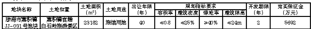 根据琼海市人民政府《关于琼海市嘉积镇JJ-031号地块具备净地出让条件的证明》,琼海市嘉积镇JJ-031号地块土地权利清晰、安置补偿落实到位、地上附着物清表、无法律经济纠纷、土地开发利用规划条件明确、符合土壤环境质量要求、具备动工开发所必需条件。按照《海南省国土资源厅 海南省发展和改革委员会 海南省规划委员会 海南省工业和信息化厅 海南省财政厅 海南省商务厅 国家税务总局海南省税务局关于印发<海南省建设用地出让控制指标(试行)>的通知》(琼国土资规〔2018〕7号)有关规定,此宗地按照投资强度指标为300万元/亩,年度产值指标为450万元/亩,年度税收指标为12万元/亩开发建设,项目约定达产时间为签订《国有建设用地使用权出让合同》后的3年内。以上控制指标和达产时间按规定列入《产业项目发展和用地准入协议》,属于协议内容的组成部分,竞得人应严格履行协议内容。该宗土地项目应采用装配式建造方式建设,按装配式建筑有关规定执行。二、竞买要求及条件:(一)中华人民共和国境内外的自然人、法人和其他组织均可申请参加(除法律法规另有规定外),仅限单独申请,不接受联合申请(注:失信被执行人不得参加本次竞买)。(二)本次国有建设用地使用权挂牌出让设有底价,按照报价最高且不低于底价的原则确定竞得人。(三)竞买保证金可以现金方式支付,也可以使用银行保函方式缴纳。使用银行保函方式提供竞买保证金的,应符合海南省自然资源和规划厅《关于海南省土地交易市场竞买保证金可使用银行保函的通知》(琼自然资规〔2022〕7号)有关规定。(四)申请人竞得土地后,拟成立项目公司进行开发建设的,竞得人在项目公司中出资比例不得低于50%(不含50%)。(五)竞得人在签订《挂牌成交确认书》之日起5日内,由竞得人成立的项目公司或竞得人与琼海市招商局签订《产业项目发展和用地准入协议》,并在签订《产业项目发展和用地准入协议》后与琼海市自然资源和规划局签订《国有建设用地使用权出让合同》,依法办理土地登记手续。三、申请人可于2022年10月31日至2022年11月30日到琼海市土地储备整理交易中心(或海南省公共资源交易服务中心一楼受理大厅3号窗口)查询和获取挂牌出让文件。也可从海南省建设用地使用权和矿业权网上交易系统(以下简称网上交易系统,网址:http://lr.hainan.gov.cn:9002)查看和打印。四、申请人可于2022年10月31日至2022年11月30日到琼海市土地储备整理交易中心提交书面申请,交纳竞买保证金的到账截止时间为2022年11月30日17时00分。提供纸质保函方式缴纳竞买保证金的送达截止时间为2022年11月28日17时00分。经审查,申请人按规定交纳竞买保证金,具备申请条件的,我局将在2022年12月1日17时00分前确认其竞买资格。五、本次国有建设用地使用权挂牌出让地点:海南省政府会展楼二楼省公共资源交易服务中心土地交易厅,挂牌时间为:(一)起始时间:2022年11月21日8时30分。(二)截止时间:2022年12月2日10时00分。六、其他需要公告的事项:(一)本次挂牌出让实施机构为琼海市土地储备整理交易中心,详细情况请登录:http://www.landchina.com、http://zw.hainan.gov.cn/ggzy/、http://Ir.hainan.gov.cn/。本次挂牌事项如有变更,将在以上网站公告,届时以变更公告为准。(二)本次挂牌出让竞买报价只接受书面报价,不接受电话、电子邮件、口头等方式报价,节假日不受理报名、报价。七、联系方式:联系地址:琼海市金海路233号。联系电话:0898-62811911。联系人:蔡先生。八、本公告未尽事宜,详见挂牌出让文件,该文件所载内容为本公告的组成部分。
