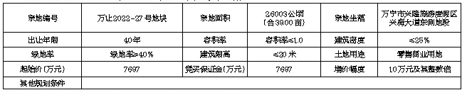 六、其他需要公告的事项:(一)按照《海南省自然资源和规划厅关于海南省土地交易市场竞买保证金可使用银行保函的通知》(琼自然资规〔2022〕7 号)要求,竞买人可使用银行保函方式缴纳竞买保证金,保函应为不可撤销、见索即付保函,保函担保金额应不少于全额土地竞买保证金,保函的保证期限应当自保函开立之日起至招标拍卖挂牌交易活动结束后不少于60日,保函需在保证金交纳截止时间前2个工作日内送达万宁市自然资源和规划局。(二)竞买成交当场签订《成交确认书》,并在30日内与我局签订《国有建设用地使用权出让合同》,按《国有建设用地使用权出让合同》约定开工,涉及水务、绿化、卫生、环境保护、消防安全、交通管理和设计施工等应符合国家、海南省的有关规定。