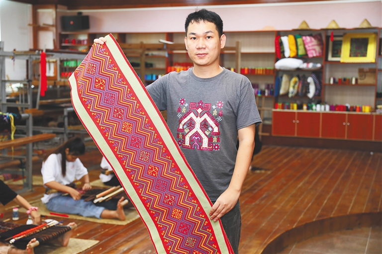 “按黎族传统习俗,男性一般负责打猎、捕鱼、农耕,织锦是妇女们的‘专属’技艺,在一些人看来,男孩子织锦有些另类。”陈达谞笑着回忆,刚学织锦那几年,他很怕别人看到他织锦会说闲话,经常关门关窗在家里独自练习,也不出门和小伙伴玩。