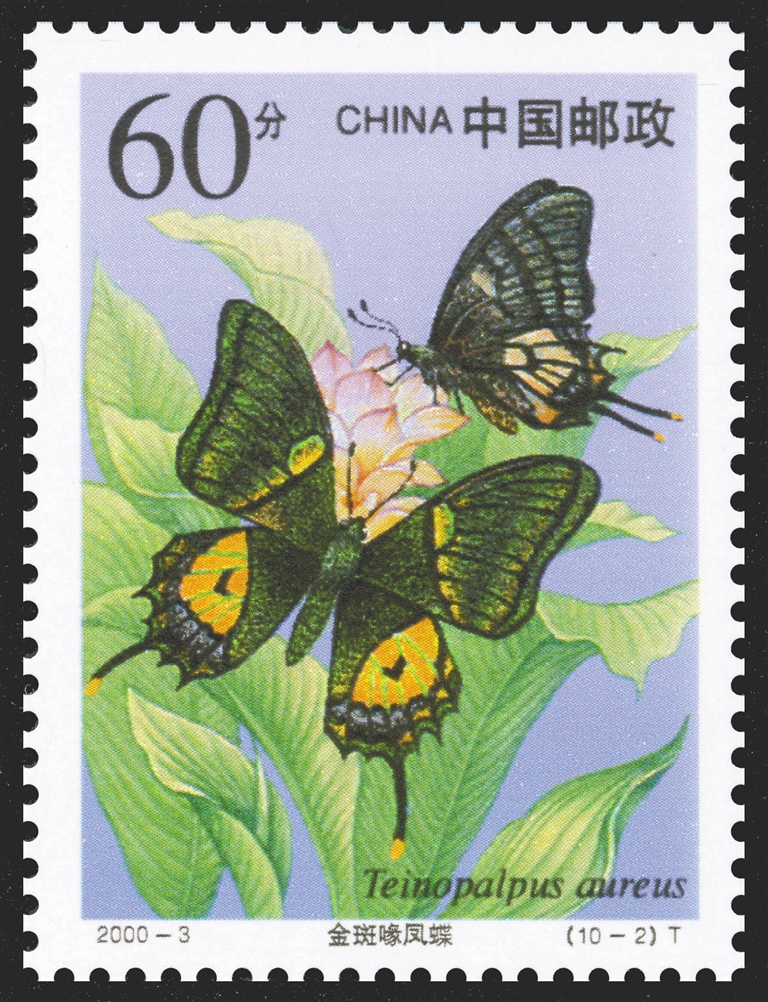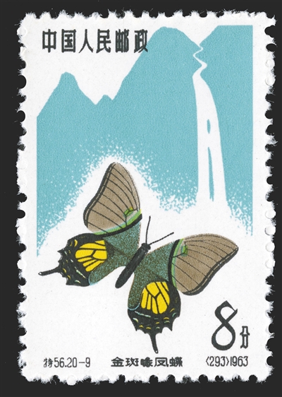1963年4月,原国家邮电部发行了一套20枚《蝴蝶》特种邮票,为中国发行枚数最多的动物邮票,规格为23.5×66毫米,发行量100万枚。其中,第九枚为“金斑喙凤蝶”,面值8分。
