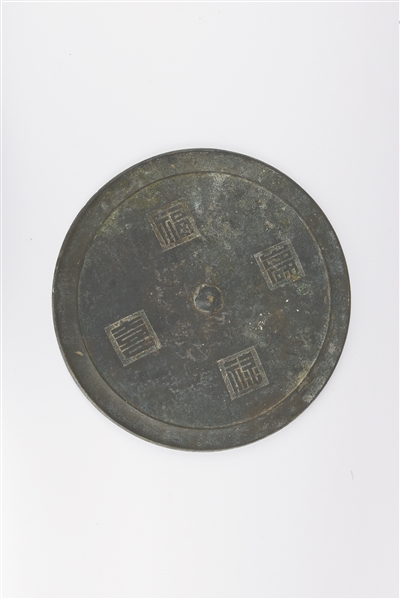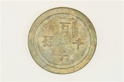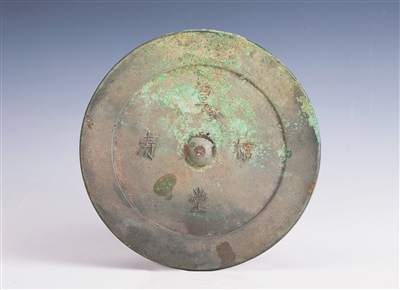 海口市博物馆藏的明代“萱堂福寿”铭铜镜,是铭文镜,也是祝寿镜。此镜为圆形,半球钮,镜背部环绕镜钮铸有四字铭文,上下右左分别为“萱堂福寿”。此镜铭文为工匠用尖状工具刻于陶模之上铸造而成,字体简洁但略显稚拙,与常见的楷书或艺术字的铜镜铭文明显不同。