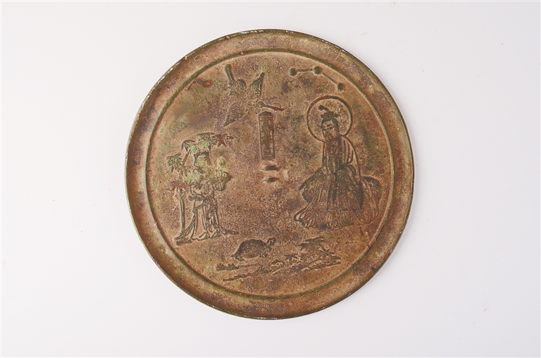 明仙人龟鹤齐寿纹铜镜画面中的人物、龟、鹤和山石等元素,是宋金时期人物故事类铜镜上常见的题材。从铭文中可识别的“青”字推测,完整铭文可能为“青铜照子”。南宋湖州镜的铸铭常称铜镜为“照子”,这缘于宋人的避讳习惯。宋太祖赵匡胤的祖父名曰赵敬,“镜”与“敬”同音,为避“镜”讳,铜镜多称为“照子”。从画面来看,此镜有明显的宋代风格,但从其窄镜缘和铜镜正面泛黄的铜质等来看,具有明代的典型特征,属于明仿宋镜的范畴。