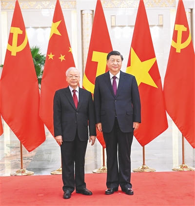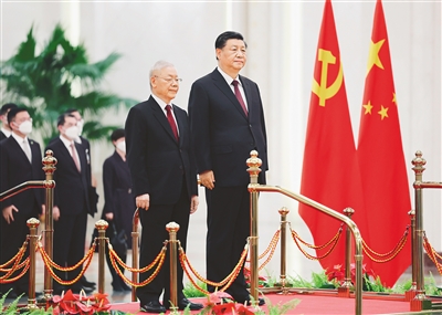 习近平热烈欢迎阮富仲在中共二十大召开后即对中国进行正式访问。习近平表示,近年来,我同阮富仲总书记同志通过多种方式保持密切沟通,就引领中越关系发展达成许多重要共识,这些共识得到全面落实,取得显著成效。