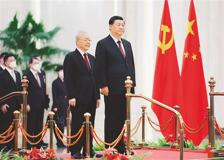 阮富仲表示,非常感谢习近平总书记邀请我率领越方领导人作为中共二十大后第一个元首级代表团访华,我也实现了向习近平总书记同志作出的将中国作为我连任越共中央总书记后首访国家的承诺。我代表越南党、政府和人民就中共二十大成功举行向中国党、政府和人民表示热烈祝贺,对习近平总书记同志再次当选中共中央总书记表示热烈祝贺,这充分体现了中国党和人民对过去十年在以习近平同志为核心的党中央坚强领导下,在习近平新时代中国特色社会主义思想的指引下,中国取得的巨大发展成就和崇高国际威望的高度认可和信赖。中国共产党取得的成就为世界发展中国家特别是走社会主义道路的国家提供了宝贵经验。我们坚信,在以习近平同志为核心的中共中央领导下,中国一定会实现中共二十大确定的目标任务,为地区和世界作出新的积极贡献。