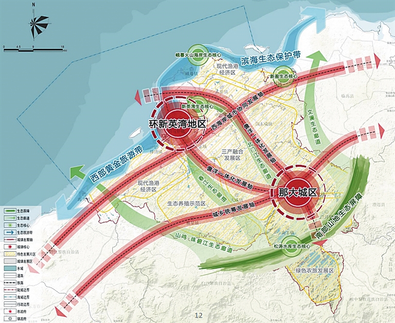 根据《总体规划》,儋州洋浦着力构建“一屏一带四廊、双核三轴多片”的市域总体战略格局。“一屏一带四廊”指的是形成由南部山地生态屏障,滨海生态保护带,山鸡—珠碧江、春江、北门江、文澜河等四条生态廊道组成的保护格局;“双核三轴多片”指的是以那大城区、环新英湾地区两大核心;儋洋一体化发展轴、西海岸城市协同发展轴、城乡统筹发展轴三条轴线;现代渔港经济区、三产融合发展区、生态养殖示范区、绿色农旅发展区等多个片区的开发格局。