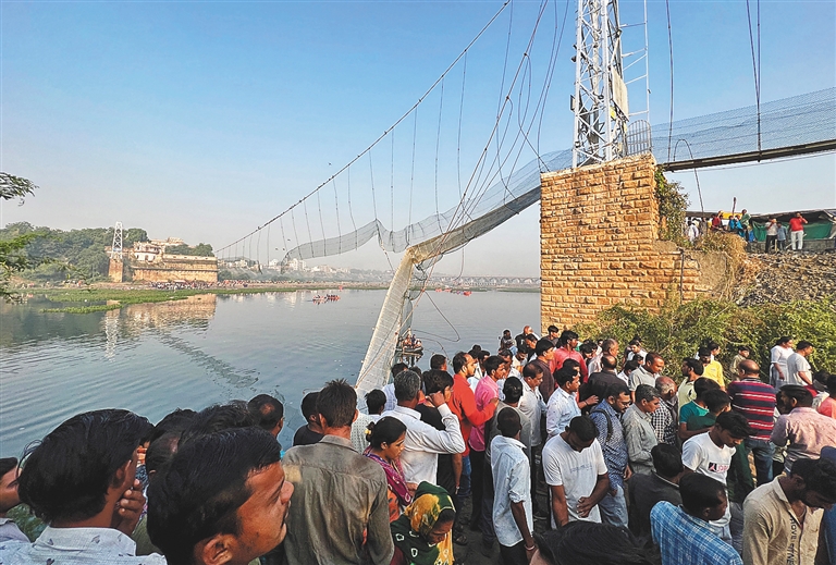 印度报业托拉斯援引当地官员的话报道,事故发生在当地时间傍晚6点半左右,目前对落水者的搜救工作正在进行。据现场目击者讲述,事发时桥面突然从中间断裂,许多人落入河中,其中包括不少妇女和儿童。