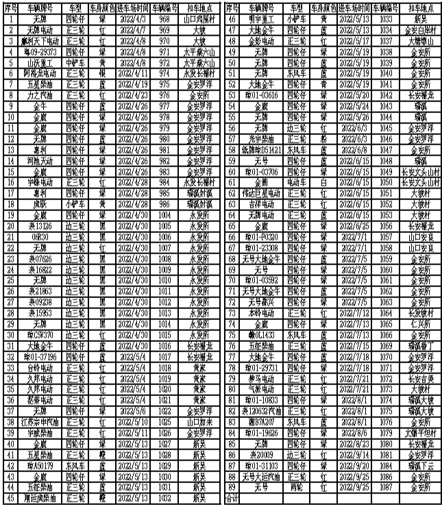 我县在2022年4月1日至2022年9月30日期间在澄迈县各乡镇执法检查过程中查处到涉嫌违法装载河砂的车辆及机具。因车辆和机具的所有权人不明,从本公告发布之日起一年内,请公告清单列表上的所有车辆和机具的所有权人携带个人身份证及其他证明车辆、机具来源材料到澄迈县综合行政执法局1楼县“多规合一”管控行政执法大队办理认领登记手续。逾期未认领的,我局将依法移送相关部门进行无主物的财产处置。办公室电话:0898-67615217,地址:海南省澄迈县金江镇金马大道党校一楼。