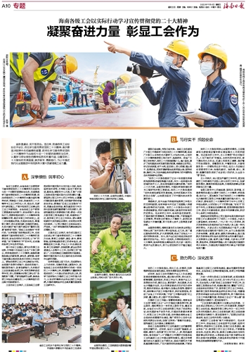 在学深悟透上狠下功夫、在成果转化上力求实效、在推动发展上展现作为,我省各级工会切实把思想和行动统一到党的二十大精神上来,把智慧和力量凝聚到落实党的二十大提出的各项任务上来,把学习成效转化为推动工会工作的强大动力,以良好的精神状态和优异的工作成绩,为推动海南经济社会高质量发展展现工会新作为。