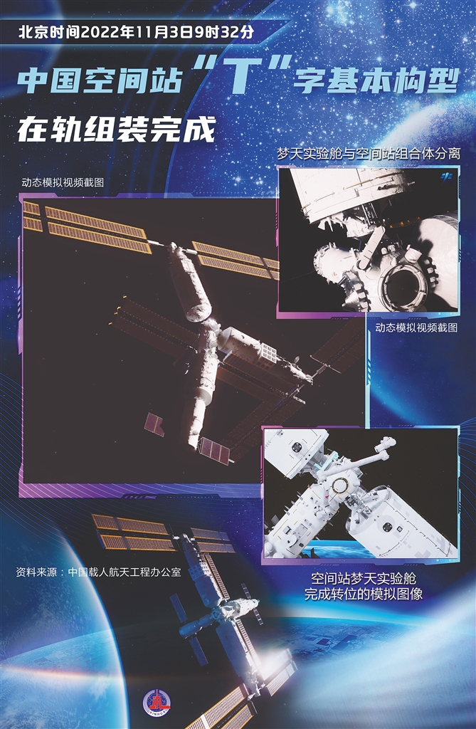 转位动作在我国空间站的建造及后续任务实施中发挥了重要作用。问天、梦天两个实验舱在发射后,首先与天和核心舱进行前向交会对接,再通过转位动作从天和核心舱前向对接口移动到侧向停泊口,从而完成空间站“T”字基本构型的建造任务。