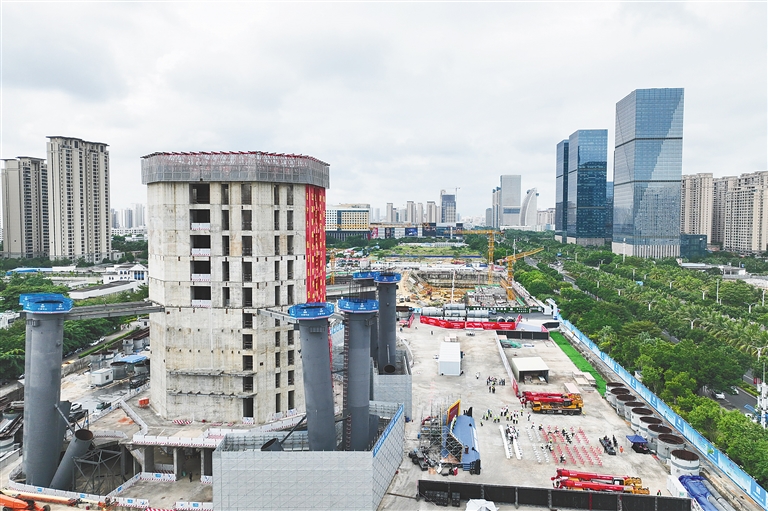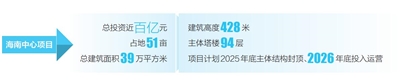 据悉,海南中心项目为原海口双子塔·南塔项目,总投资近百亿元,占地51亩,总建筑面积39万平方米,建筑高度428米,主体塔楼94层,项目计划2025年底主体结构封顶、2026年底投入运营,建成后将“刷新”海口天际线,成为海南第一高楼。
