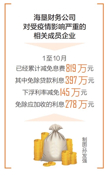 为更好发挥金融支持作用,海垦财务公司今年上半年已推出金融支持成员企业纾困解难和产业发展的八条措施,对受疫情影响严重的相关成员企业,在财务公司存量的经营性贷款采取了下浮利率、免收利息等措施予以支持,1至10月已经累计减免息费819万元,其中免除贷款利息397万元,下浮利率减免145万元,免除应加收的利息278万元。
