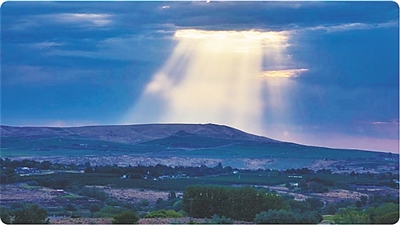 当“耶稣光”出现时,天空云卷云舒,大地雾气弥漫,阳光穿云破雾,投下集束状的光,在昏暗中留下一缕亮色,呈现一种神圣宁静的氛围。
