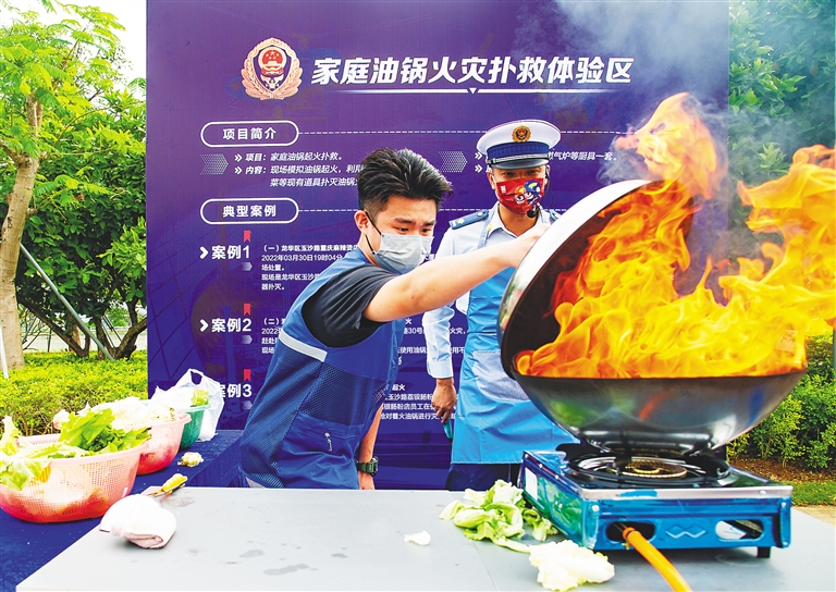 在消防器材实操体验区,消防救援人员向群众教授灭火器的正确使用方法。现场观众还进行了家庭、小区、商铺3种场景隐患的互动查找、消防过滤式自救式呼吸器佩戴、油锅灭火等模拟体验活动,观摩了真假消防产品辨析、家庭火灾案例及火灾物件、家庭防火系列消防条漫等展示,观看了电气火灾、电焊火灾和电动车过充引发火灾等实验。