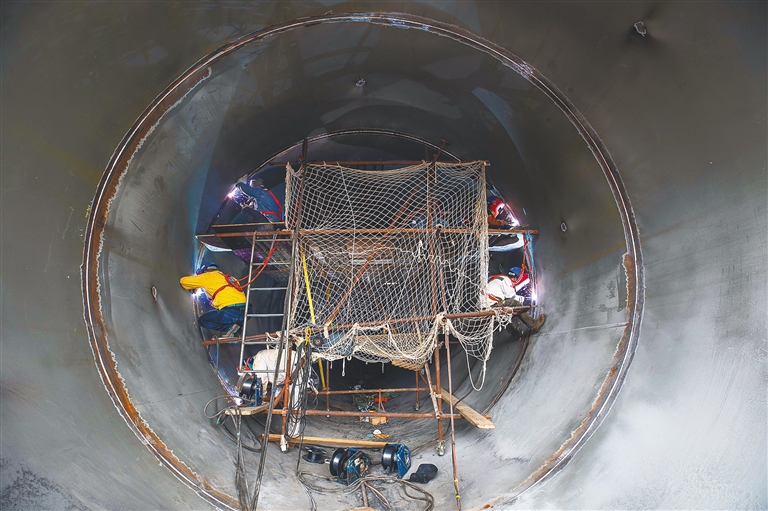 几天前,主坝坝段内压力钢管全部安装完成,这是发电厂房和引水一线的重要建设节点。趁着天气晴好,大家正铆着劲加快施工。张润林说:“目前多数施工面实现交叉作业,形成流水作业面,接下来将强化资源配置,分解任务,同时利用红旗班组创优争先,争取超额完成年度工作计划。”