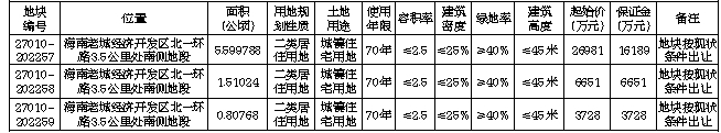 (二)宗地净地情况。该3宗地块的土地征收工作已完成,土地权属清晰,已与被征地单位签订了《土地征收协议书》,土地补偿款、安置补助费、青苗补助费和地上附着物等款项已补偿到位。目前该3宗地块上的附着物已清表、无法律经济纠纷、地块周边可以满足施工建设所需的水、电供应,相关设备、机械可以进场施工,该3宗地已具备净地出让的条件。经核查,上述3宗地不属于非法占地、违法建设行为已经处置到位并组织供应的土地。经查询全国污染地块土壤环境管理系统,该3宗地块不在系统污染或疑似污染地块范围内。二、本次国有建设用地使用权挂牌出让设有底价,按照出价最高且不低于底价的原则确定竞得人。三、开发建设要求:(一)根据《海南省建设用地出让控制指标(试行)》(琼国土资规〔2018〕7号)的规定,参照非省级产业园区房地产业中住宅用地控制指标设定,该3宗地块项目竣工时间为签订《国有建设用地使用权出让合同》后的3年内,项目竣工时投资强度不低于400万元/亩,其中27010-202257号地块项目竣工时投资强度不低于33599万元;27010-202258号地块项目竣工时投资强度不低于9062万元;27010-202259号地块项目竣工时投资强度不低于4846万元,税收与产值不设定控制指标,以上控制指标按规定列入《海南省产业项目发展和用地准入协议》,属于协议内容的组成部分。(二)其他开发建设要求。1.建筑退道路红线距离和建筑退用地界线距离,应符合日照、消防、视觉卫生、防灾、抗震等要求;建筑间距满足国家、海南省的相关规定。其中27010-202257号地块,建筑退道路红线距离:北侧退防护绿地5米、东侧退防护绿地6米;建筑退用地界线距离:东侧与商业地块相邻处退用地红线 8 米,北侧与商业地块相邻处退用地红线 16 米。27010-202258号地块,建筑退道路红线距离:西侧退防护绿地6米;建筑退用地界线距离:按照地块图则要求,南侧退用地红线10米,北侧退16米。27010-202259号地块,建筑退道路红线距离:西侧退防护绿地6米;南侧退用地红线10米。2.其他配建项目及要求。根据建设规模及周边基础设施建设条件,按照《城市居住区规划设计标准》和海南省人民政府印发的《关于加强新建住宅小区配套公共服务设施建设管理的意见》(琼府〔2017〕96号)要求,合理规划建设其他各项配套服务设施。3.机动车停车位按不少于1个/100平方米计容建筑面积标准配建。4.涉及装配式建筑的,按照我省装配式建筑相关规定和澄迈县住房和城乡建设局相关要求执行。5.该3宗地位于地质灾害易发区,项目建设前须按规定组织地质灾害危险性评估,采取措施防治地质灾害。四、竞买申请:(一)竞买人资格。1.中华人民共和国境内外的自然人、法人和其他组织均可参加竞买(法律另有规定的除外)。属境外机构(含港、澳、台地区)申请参加竞买的,按照规定需要提交工商主管部门核发的《营业执照》。本次挂牌出让不接受联合竞买。失信被执行人不得参加本次竞买。2.具有下列行为的自然人、法人和其他组织不得参加本次挂牌出让:(1)在澄迈县范围内有拖欠土地出让金的行为,并未及时改正的;(2)在澄迈县范围内有闲置土地,违法利用农村集体土地建设商品住房、擅自改变土地用途等违法行为,并未及时改正的。3.与恒大悦珑湾项目有债权债务关系的企业不得参与竞拍。4.竞得人须承担社会责任,完成恒大悦珑湾“保交楼”任务,竞得人以形成对恒大方债权的形式出资完成“保交楼”任务,其中27010-202257号地块预计不低于21136万元,27010-202258号地块预计不低于4285万元,27010-202259号地块预计不低于3142万元,以最终实际发生金额为准。缴款时间为政府要求保交楼日期之前,按项目工程进度支付。5.竞得人须按照澄迈县城镇小区配套幼儿园建设标准出资建设悦珑湾小区幼儿园并移交澄迈县人民政府,其中27010-202257号地块出资金额约740万元,27010-202258号地块出资金额约150万元,27010-202259号地块出资金额约110万元,各地块出资金额按项目工程进度支付。6.竞买人在报名前可与澄迈县房地产风险防范工作领导小组办公室(设在澄迈县住房与城乡建设局)对接,完全知晓出让宗地的条件以及竞得后所承担的责任与风险,并向澄迈县房地产风险防范工作领导小组办公室出具书面承诺,承诺已完全知晓出让宗地的条件以及竞得后所承担的责任与风险,如竞得该宗国有建设用地使用权,将严格按照要求进行项目开发建设和经营管理,并履行相关义务。(二)交易资料获取方式。本次挂牌出让的详细信息和具体要求,见挂牌出让手册及其他相关文件。手册和相关文件可从海南省建设用地使用权和矿业权网上交易系统(以下简称网上交易系统,网址:http://lr.hainan.gov.cn:9002)查看和打印。(三)竞买申请方式。本次交易活动竞买申请环节采取线上方式进行,有意向的竞买人可登录网上交易系统提交竞买申请,按要求上传竞买申请文件。不接受电话、邮寄、书面、口头等其他形式的申请。竞买申请时间:2022年11月9日09时00分至 2022年12月7日16时00分(以网上交易系统服务器时间为准,下同)。(四)竞买保证金。竞买人在网上交易系统提交竞买申请时,应选定一家银行缴纳竞买保证金或使用银行保函方式提供竞买保证金。竞买人选定银行缴纳竞买保证金的,选定银行后系统自动生成唯一的随机竞买保证金账号,保证金交纳银行一经选定不能更改,竞买人应谨